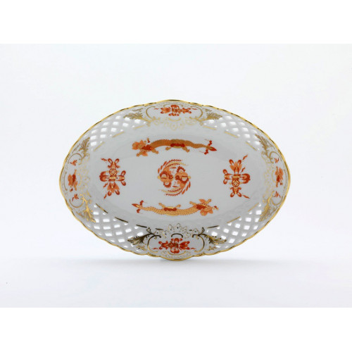 Schale, durchbr. oval, Reicher Drache,rot,goldschattiert,Schilderornamente goldstaff.Goldrand, L 22 cm