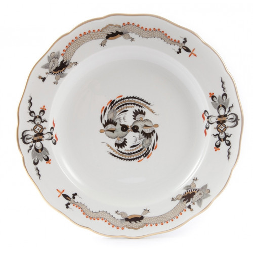Teller m.H., Reicher Drache, schwarz, rot- und goldschattiert, Goldrand, ø 25 cm