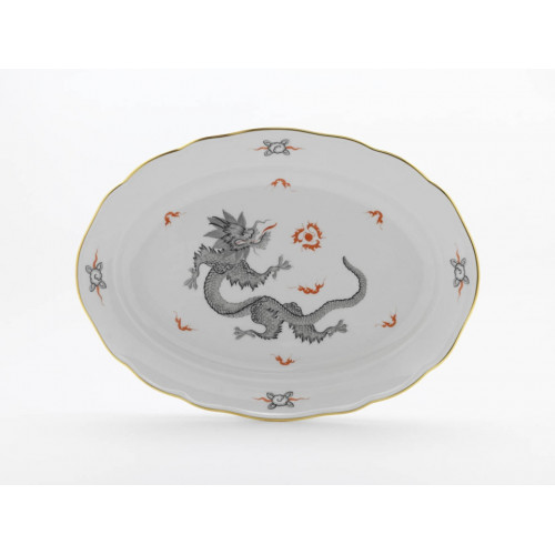 Platte, oval, Form "Neuer Ausschnitt", Ming-Drache, reich, schwarz, ohne Kante, Goldrand, L 35 cm