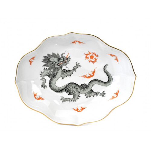 Schälchen, Form "Neuer Ausschnitt", Ming-Drache, reich, schwarz, ohne Kante, Goldrand, L 16 cm