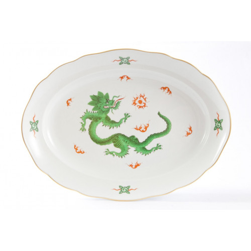 Platte, oval, Ming-Drache, reich, grün, ohne Kante, Goldrand, L 35 cm