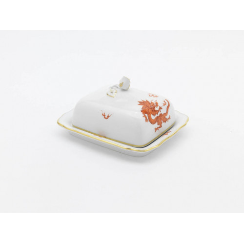 Butterdose 2-teilig, Form "Neuer Ausschnitt", Ming-Drache, reich, rot, ohne Kante, Goldrand, L 16,5 cm