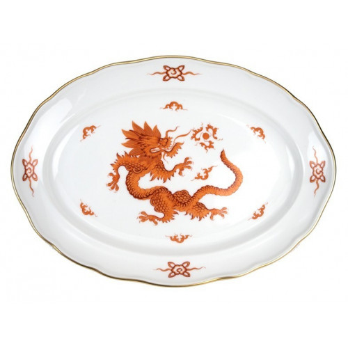 Platte, oval, Ming-Drache, reich, rot, ohne Kante, Goldrand, L 25 cm