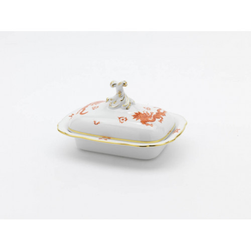 Gemüsenapf, eck., Ming-Drache, reich, rot, ohne Kante, Goldrand, 20 cm