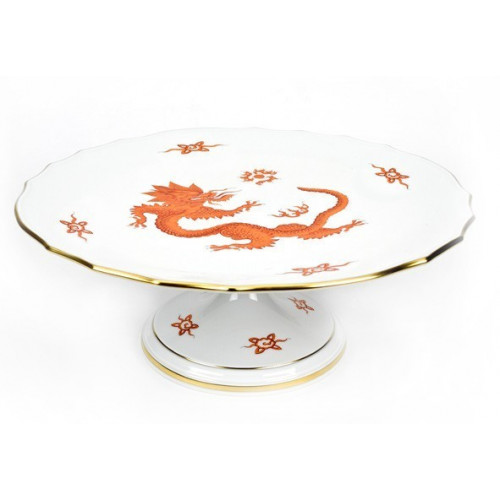 Tortenplatte auf Fuß, rund, Ming-Drache, reich, rot, ohne Kante, Goldrand, ø 32 cm