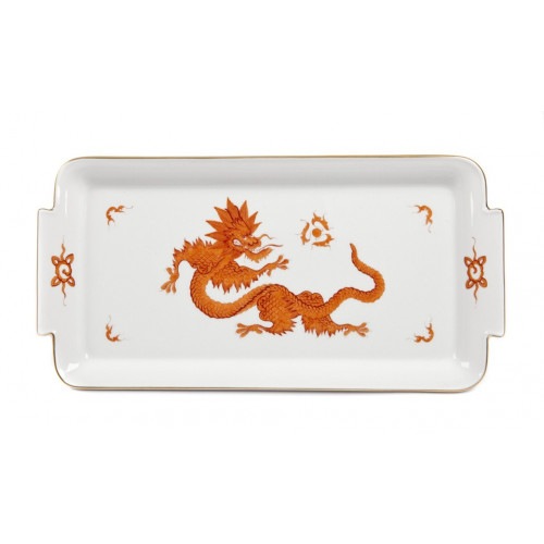 Platte,rechteck., Ming-Drache, reich, rot, ohne Kante, Goldrand, L 29 cm