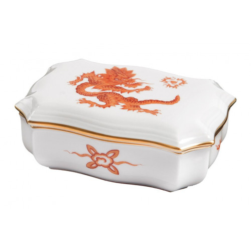 Dose, Form "Neuer Ausschnitt", Ming-Drache, reich, rot, ohne Kante, Goldrand, L 10 cm