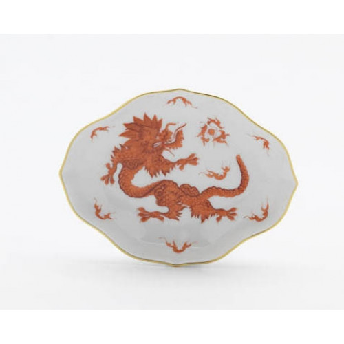 Schälchen, Form "Neuer Ausschnitt", Ming-Drache, reich, rot, ohne Kante, Goldrand, L 12 cm