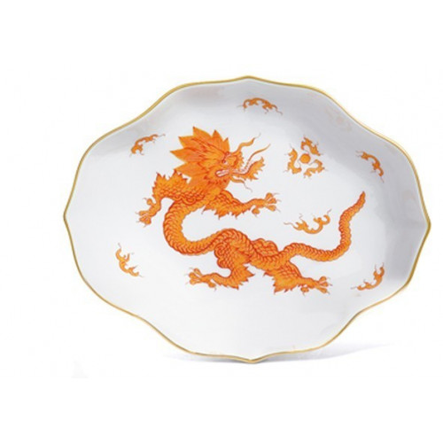 Schälchen, Form "Neuer Ausschnitt", Ming-Drache, reich, rot, ohne Kante, Goldrand, L 18 cm