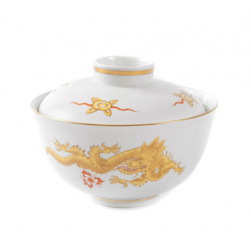 Schüssel m.Deck., Ming-Drache, reich, gelb, ohne Kante, Goldrand, H 9,4 cm