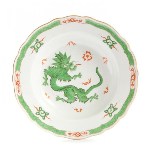 Suppenteller, Form "Neuer Ausschnitt", Ming-Drache, reich, grün, mit Kante, Goldrand, ø 22 cm