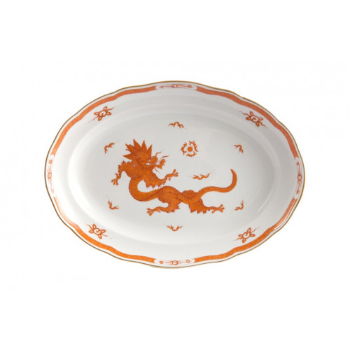 Platte, oval, Ming-Drache, reich, rot, mit Kante, Goldrand, L 42 cm