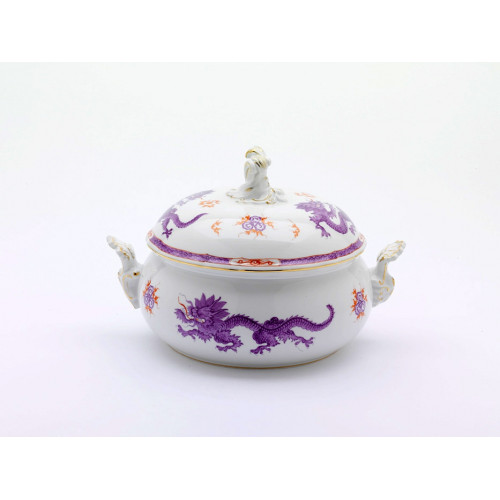 Terrine, rund mit Schnörkel, Form "Neuer Ausschnitt", Ming-Drache, reich, lila, mit Kante, Goldrand, V 1,75 l