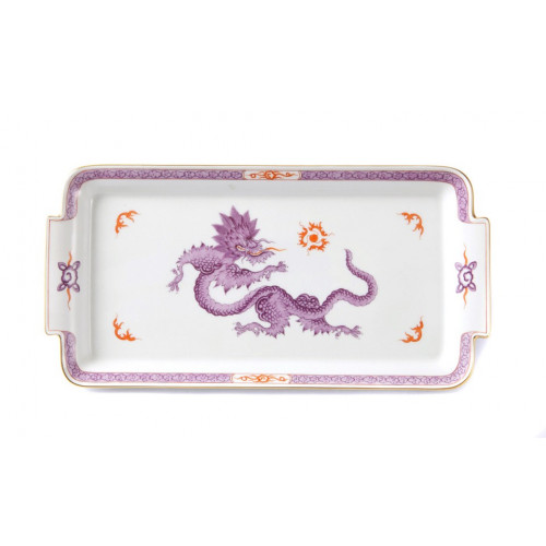 Platte,rechteck., Ming-Drache, reich, lila, mit Kante, Goldrand, L 29 cm
