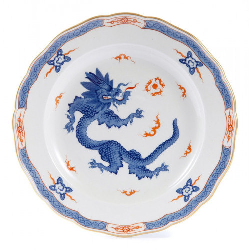 Suppenteller, Form "Neuer Ausschnitt", Ming-Drache, reich, kobaltblau, mit Kante, Goldrand, ø 22 cm