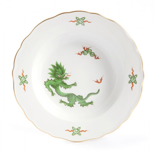 Suppenteller, Form "Neuer Ausschnitt", Ming-Drache, leicht, grün, ohne Kante, Goldrand, ø 24 cm