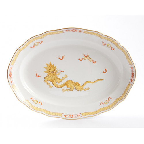 Platte, oval, Ming-Drache, leicht, gelb, mit Kante, Goldrand, L 35 cm