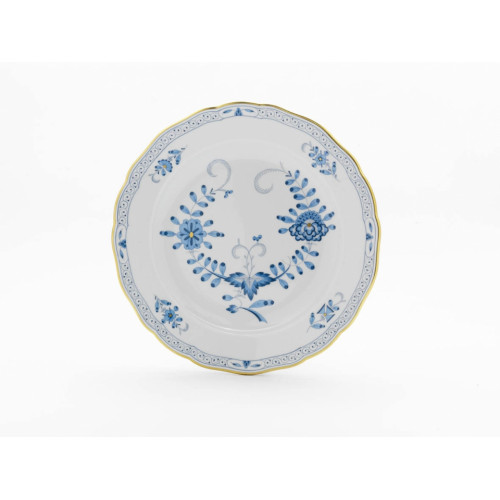 Speiseteller, Form "Neuer Ausschnitt", Indische Malerei 2 mit Kante, hellblau, Goldpunkte, Goldrand, L 25 cm