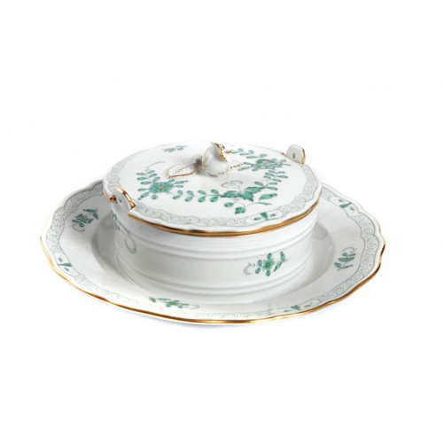 Butterdose 2-teilig, Indische Malerei 2 mit Kante, grün, Goldpunkte, Goldrand, 21 cm