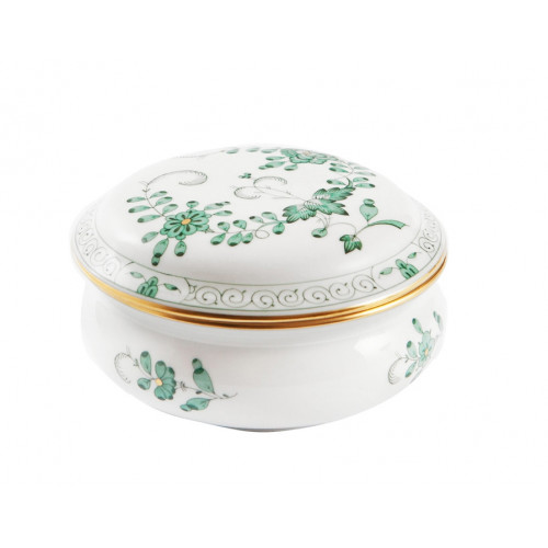 Dose, Form "Neuer Ausschnitt", Indische Malerei 2 mit Kante, grün, Goldpunkte, Goldrand, ø 9 cm