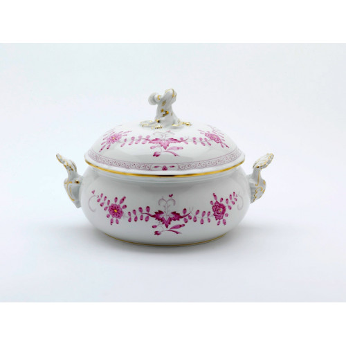 Terrine, rund mit Schnörkel, Form "Neuer Ausschnitt", Indische Malerei 2, mit Kante, purpur, Goldpunkte, Goldrand, V 1,75 l