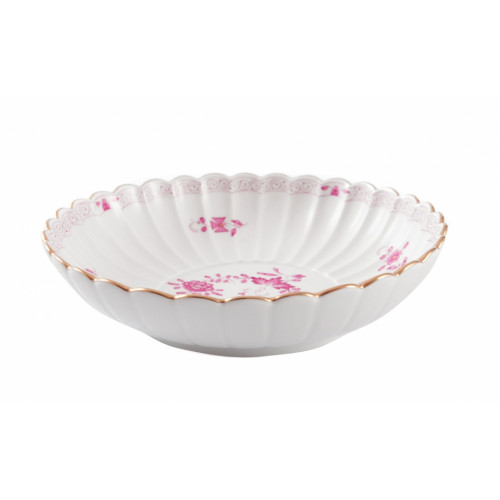 Beilageschale rund,gemuschelt, Form "Neuer Ausschnitt", Indische Malerei 2, mit Kante, purpur, Goldpunkte, Goldrand, ø 20 cm