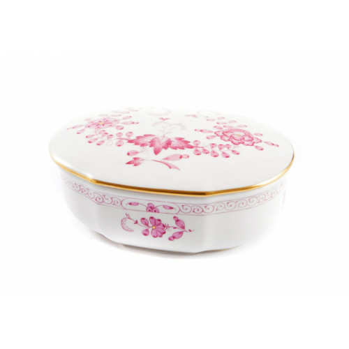 Dose, Form "Neuer Ausschnitt", Indische Malerei 2, mit Kante, purpur, Goldpunkte, Goldrand, L 9,5 cm