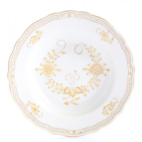 Suppenteller, Form "Neuer Ausschnitt", Indische Malerei 2 mit Kante, gelb, Goldpunkte, Goldrand, ø 22 cm