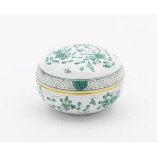 Dose, Form "Neuer Ausschnitt", Indische Malerei, grün, Goldpunkte, Goldrand, ø 7,5 cm