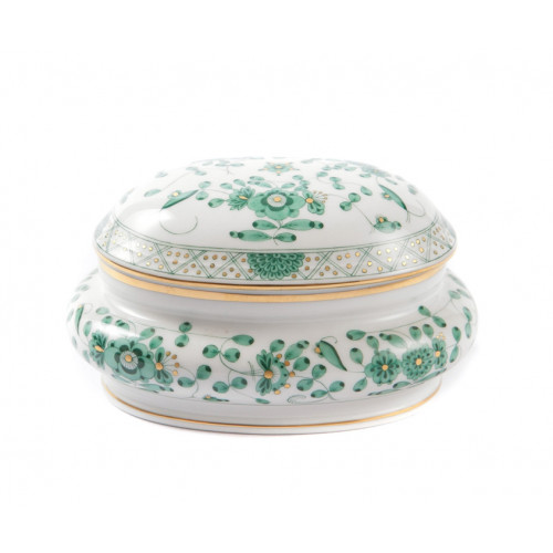 Dose, Indische Malerei, grün, Goldpunkte, Goldrand, L 12 cm
