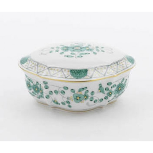 Dose, Form "Neuer Ausschnitt", Indische Malerei, grün, Goldpunkte, Goldrand, L 9,5 cm