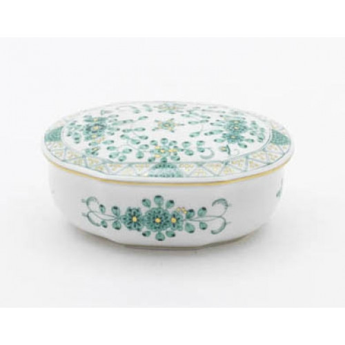 Dose, Form "Neuer Ausschnitt", Indische Malerei, grün, Goldpunkte, Goldrand, L 9,5 cm