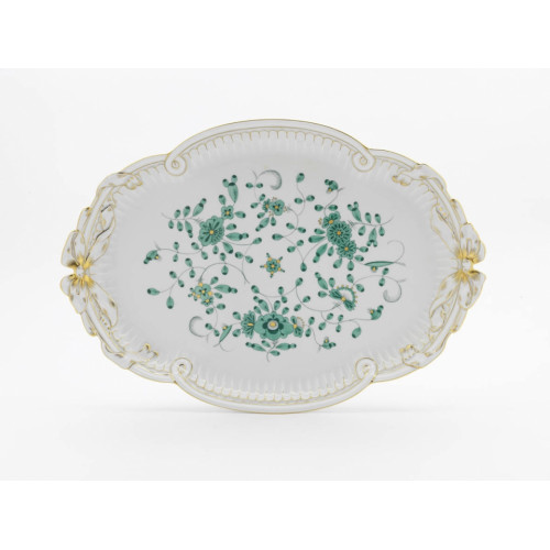 Platte, oval, Indische Malerei, grün, Goldpunkte, Goldrand, L 40 cm
