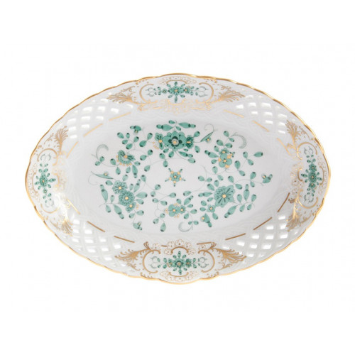 Schale, durchbr. oval, Indische Malerei,grün,Goldpunkte,Schilderornamente goldstaff.,Goldrand, L 25 cm
