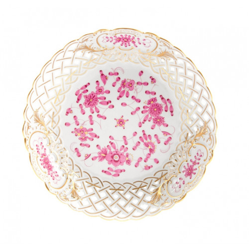 Schale, durchbr. rund, Form "Neuer Ausschnitt", Indische Malerei, purpur, Goldpunkte, Goldrand und Goldstaffage, ø 21 cm