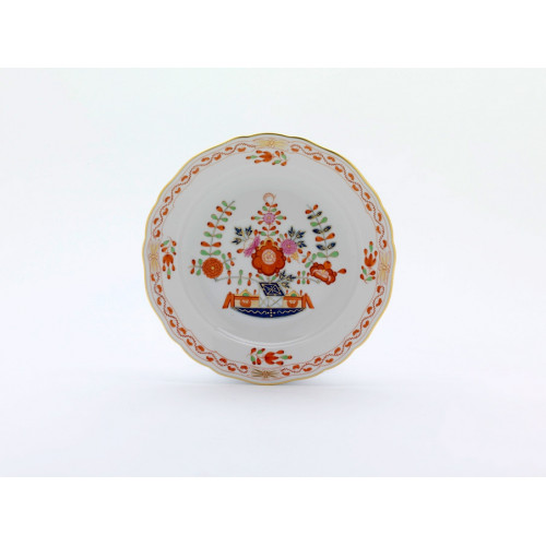 Teller, Form "Neuer Ausschnitt", Tischchenmuster, bunt, goldschattiert, Goldrand, ø 18 cm