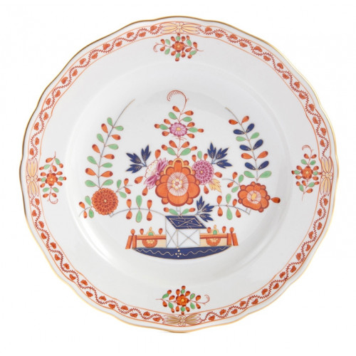 Teller m.H., Form "Neuer Ausschnitt", Tischchenmuster, bunt, goldschattiert, Goldrand, ø 25 cm