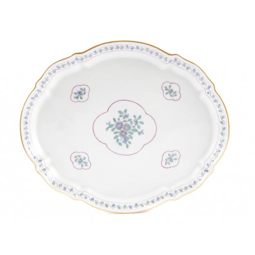 Platte, oval, Form "Neuer Ausschnitt", Blütenzweig, stilisiert, leicht, purpur Schild, blau, m.Kante,Goldrand, L 27 cm