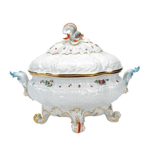 Terrine mit Delphin, Form "Schwanendessin", Indische Blumenzweige, gestreute Blümchen, Goldkante, Goldrand, V 1,65 l
