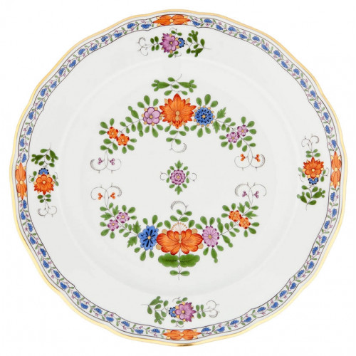 Speiseteller, Form "Neuer Ausschnitt", Indische Blumenmalerei, zweiteilig, bunt mit Kupferfarben, Goldrand, ø 25 cm