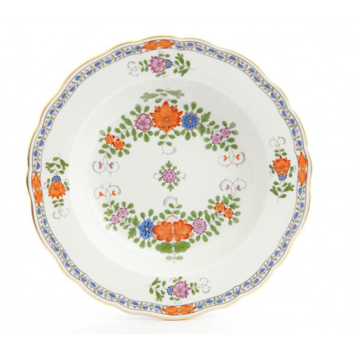 Suppenteller, Form "Neuer Ausschnitt", Indische Blumenmalerei, zweiteilig, bunt mit Kupferfarben, Goldrand, ø 24 cm