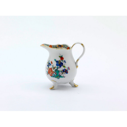 Milchkännchen mit Füßen, Form "Neuer Ausschnitt", Reiche ind.Blumen-u.Vogelm.m.grün.Felsen u.Kante.bunt m.Kpferf.Goldrd., 0,15 l