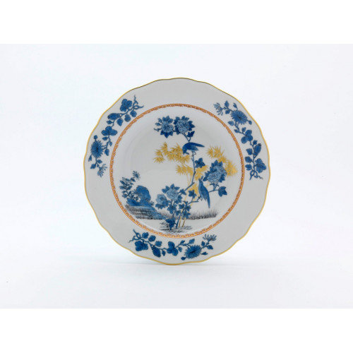 Teller, Form "Neuer Ausschnitt", Ind.Malerei,blau m.Kupferf.m.goldgrav.Bambus,Kte.rot u.gold,Goldrand, ø 20 cm