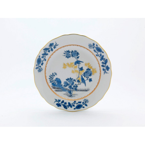 Speiseteller, Form "Neuer Ausschnitt", Ind.Malerei,blau m.Kupferf.m.goldgrav.Bambus,Kte.rot u.gold,Goldrand, L 25 cm