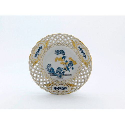 Teller, durchbr., Ind.Malerei,blau m.Kupferf.m.goldgrav.Bambus,Kte.rot u.gold,Goldstaff., ø 19 cm