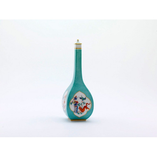 Flakon, Jap.Astmotive m.Blüten u.roten Löwen,i.Kakiemonst.,meergrüner Fond, H 25 cm