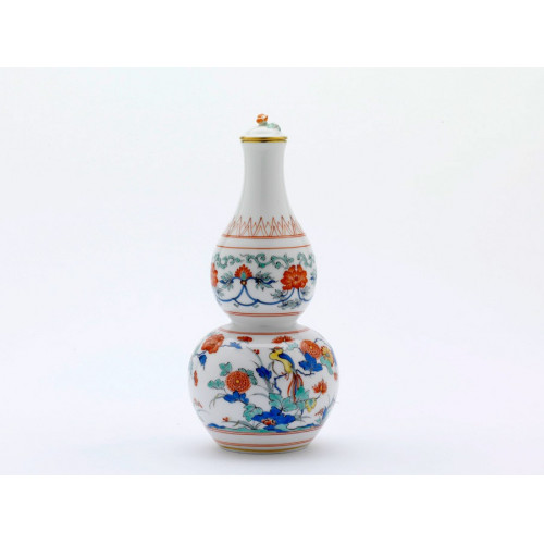 Flakon, Stil.jap.Felsen,Blüten u.Vögel,bunt m.Kupferf.,Kante rot,Goldrand, 21 cm