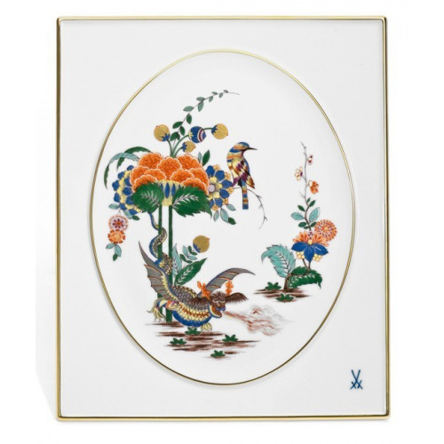Wandplatte, Ostasiatische Blumenmalerei m.Flugdrachen u.zwei Vög.bunt m.Kpff.Gldr., 20,5 x 25 cm