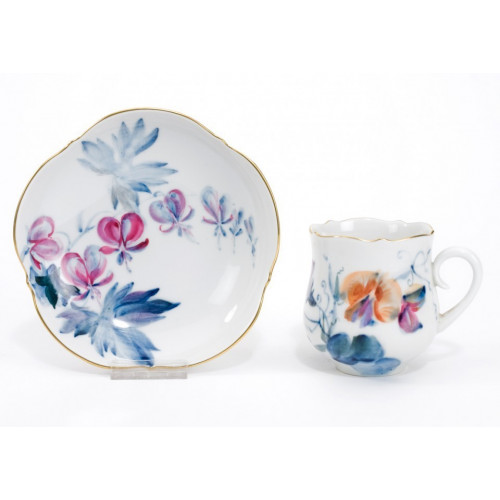 Kaffeetasse m.U., Blumenmalerei,kombiniert Unterglasur,kobaltblau u.Aufglasurm.,Goldrand
