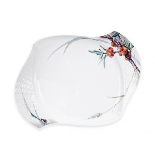 Platte, oval, Form "Wellenspiel Relief", Waldflora mit Insekten, bunt, weißer Rand, L 25,5 cm